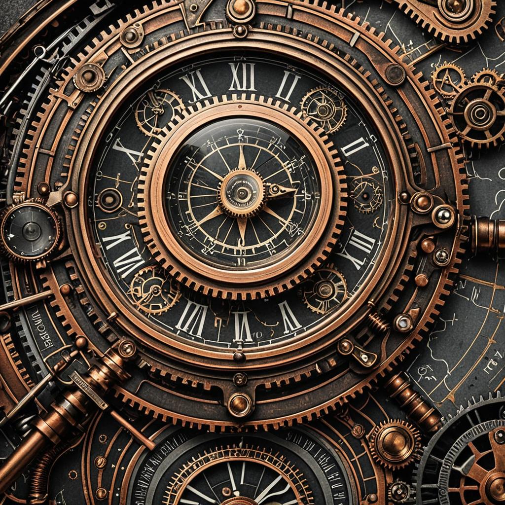 Eye spy map that is a visual treasure trove of steampunk inventions. Highly detailed and includes intricate design elements with bronze, copper hues with industrial greys. Lighting is bright and vibrant, designed digitally.