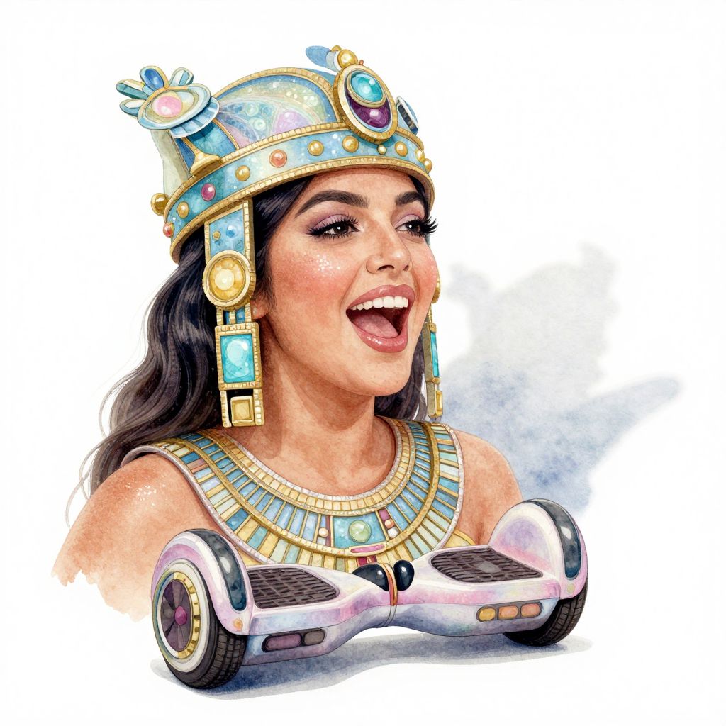 Hoverboards beautiful venezualan woman in aztec costume, foreground of an extatic face, soft lighting, shimmering, pastel colours, watercolours, clean white background, shadowy 300dpi,