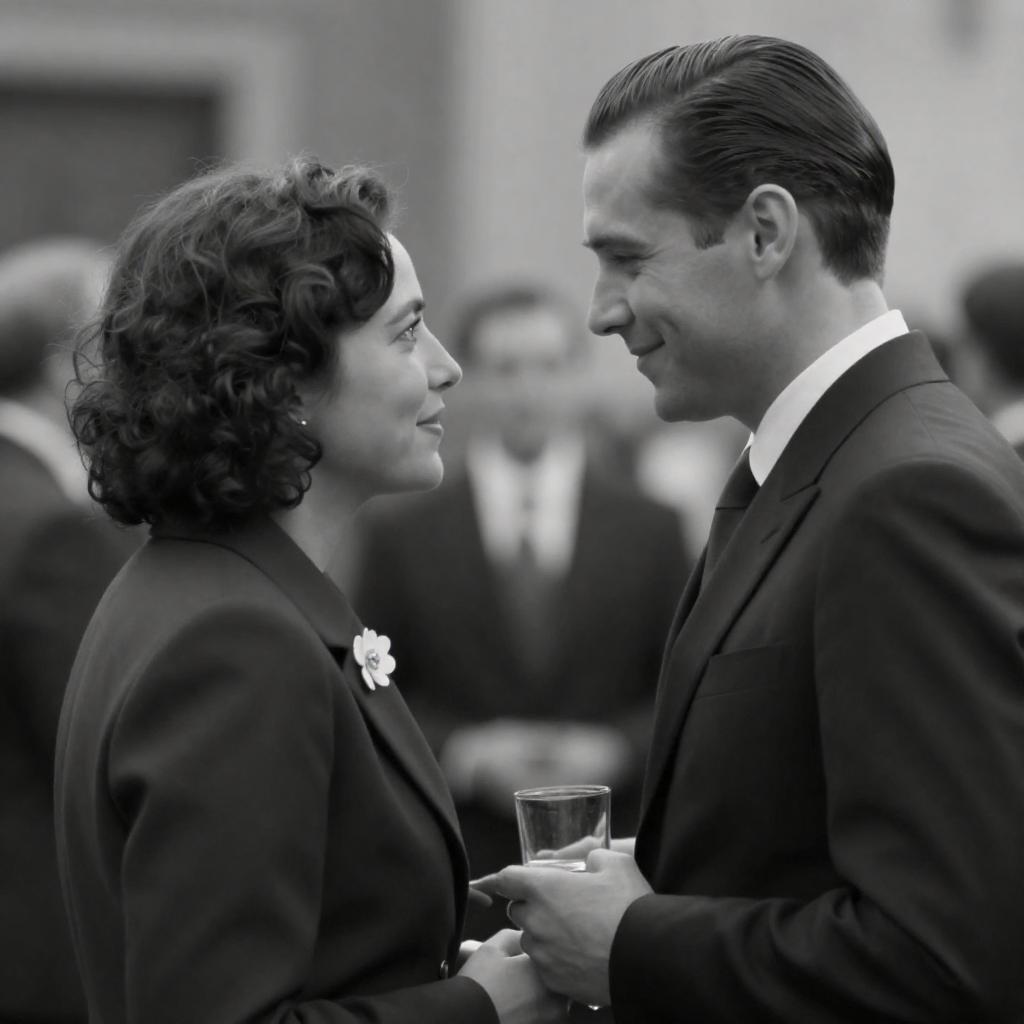 Black-and-white photograph of a man and woman in formal attire, facing each other in a close, intimate conversation. The man, with slicked-back hair and a dark suit, smiles at the woman. She has short, curly hair, wears a dark jacket with a white flower pin, and holds a glass. Background is blurred, focusing attention on the couple.