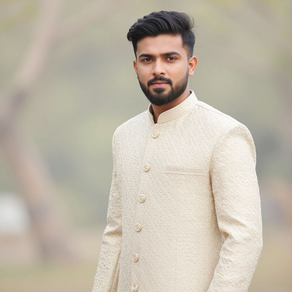Groom wedding dress sherwani, 1boy, male focus, solo, facial hair, beard, flower, looking at viewer, blurry, black hair, outdoors, blurry background, photo background, mustache, standing, coat, realistic, long sleeves