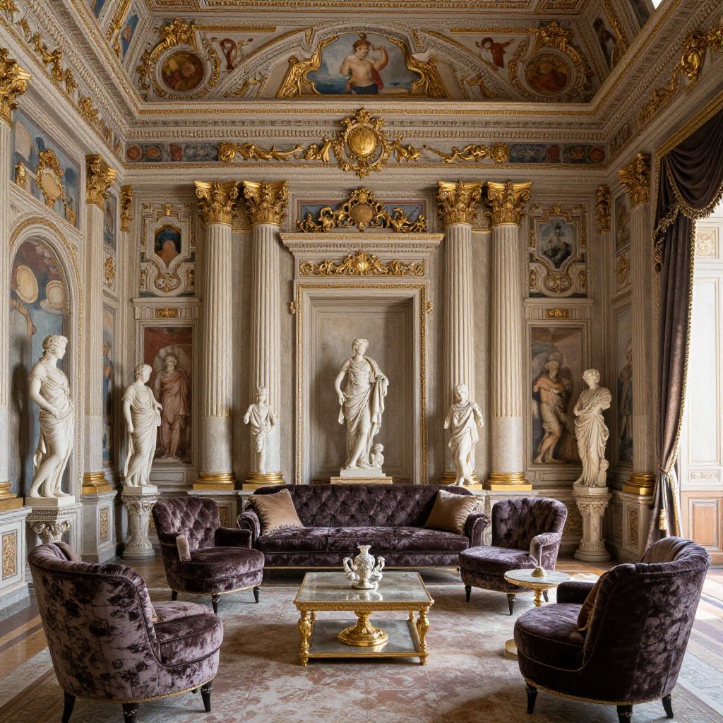 Roman style decor in a luxurious room showcasing frescoed walls, ornate gold accents, Corinthian columns, plush velvet furnishings, and classical sculptures under soft natural light.