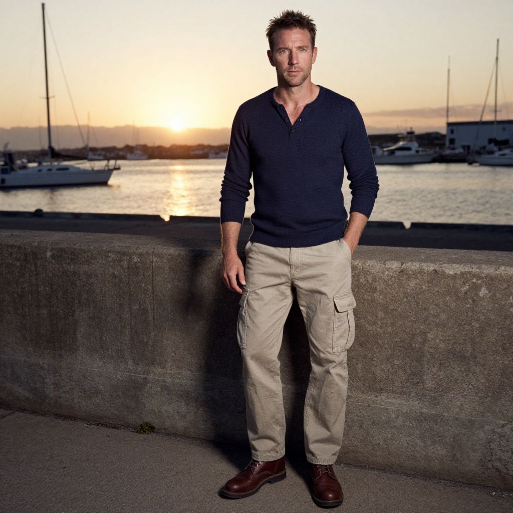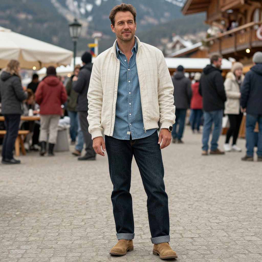 A man, thermal henley in navy, soft cotton lounge pants in light gray, cozy and casual, bustling après-ski scene, ektachrome film stock, relaxed smile, enjoying the atmosphere. Man has masculine face and piercing eyes
