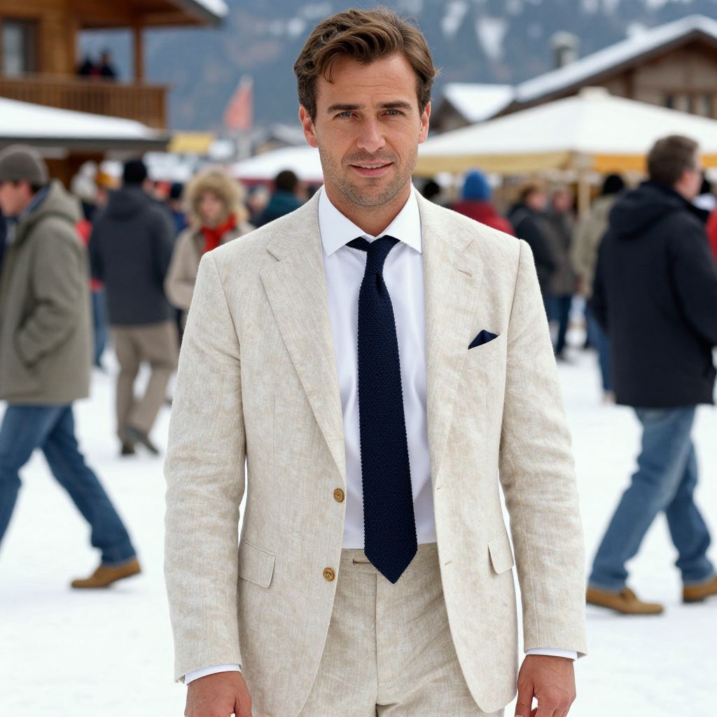 Photograph of a handsome, casually-dressed man in a dark navy sweater and white pants, standing in a snowy, bustling outdoor market.