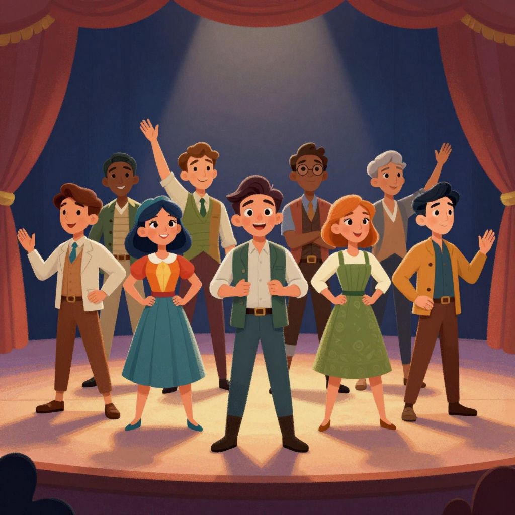 Actor cartoon illustration featuring a group of diverse actors on stage performing a play, colorful costumes and stylized features, soft shadows with a theater backdrop, whimsical animation style with fluid brush strokes.