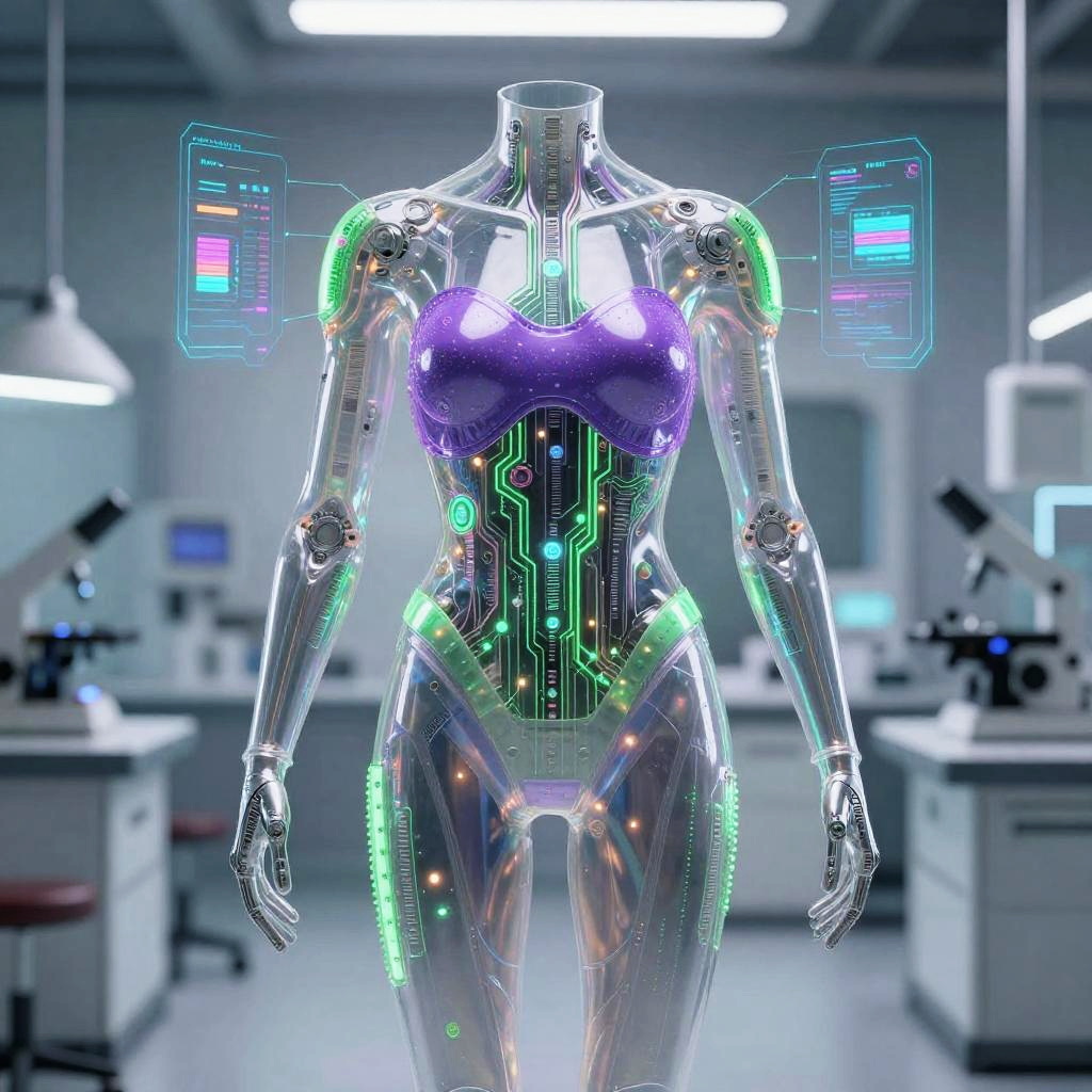 Scifi bodysuit design featuring transparent sections and embedded circuits, vibrant purple and green hues, futuristic lab environment, advanced holographic effects, detailed anatomy