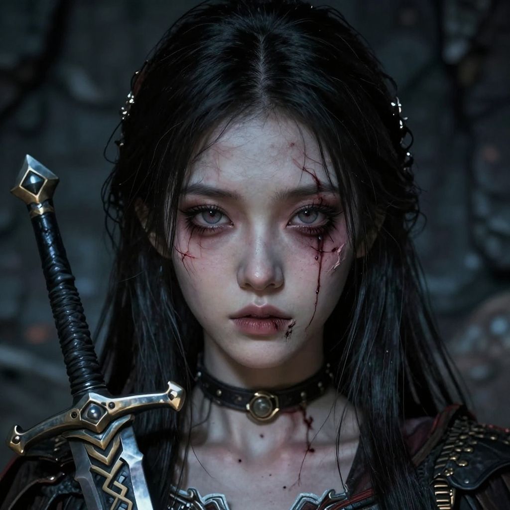 Digital artwork of a pale, blood-streaked, dark-haired woman with piercing eyes, wearing a black choker, and holding a silver sword.