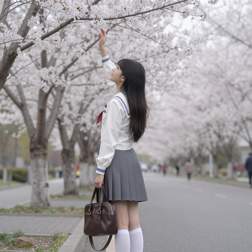 Young Asian woman with long black hair, standing on a sidewalk, back to the camera, reaching up to cherry blossoms. Wearing white long-sleeve sailor top, gray pleated skirt, white knee-high socks, brown handbag. Cherry blossom trees on both sides, branches filled with white flowers. Soft daylight, overcast sky. Pathway extends into the distance.