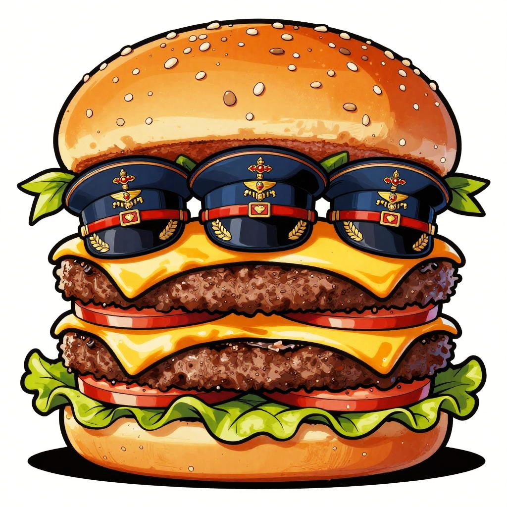 Nazi cheeseburger, satirical political cartoon style, exaggerated burger layers with Nazi-era uniforms and insignias represented as ingredients, bright bold colors, comic strip aesthetic