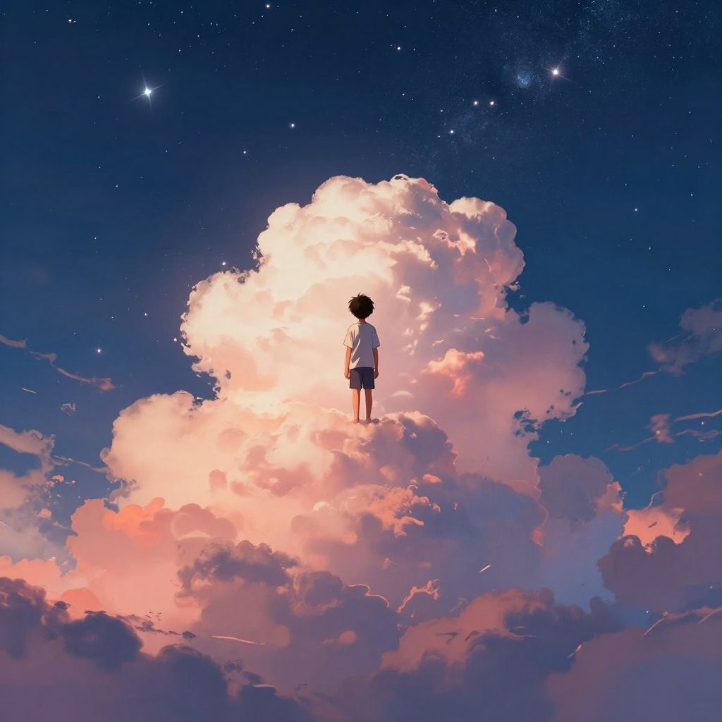 Digital illustration of a young boy with tousled black hair, wearing a blue hoodie with rainbow stripes and a black backpack, standing in a dreamy, vibrant night sky. The sky is filled with colorful clouds in shades of blue, pink, and orange, with a crescent moon and stars. The boy gazes upwards, his expression curious and hopeful. The artwork has a whimsical, fantasy style with vivid colors and soft textures, creating a magical, otherworldly atmosphere.