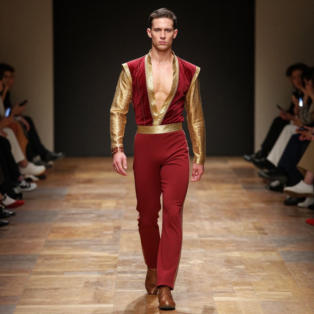 Transition Dance Costume, male in a red and gold costume walking down a runway