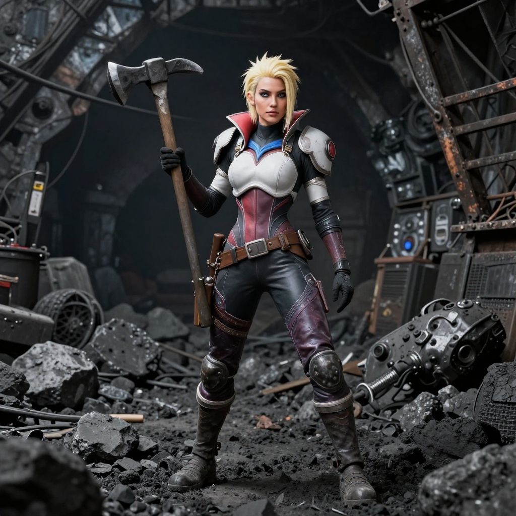 Digital artwork of a blonde, muscular woman in a black and white armored suit, holding a pickaxe, standing in a dark, industrial rubble-filled tunnel