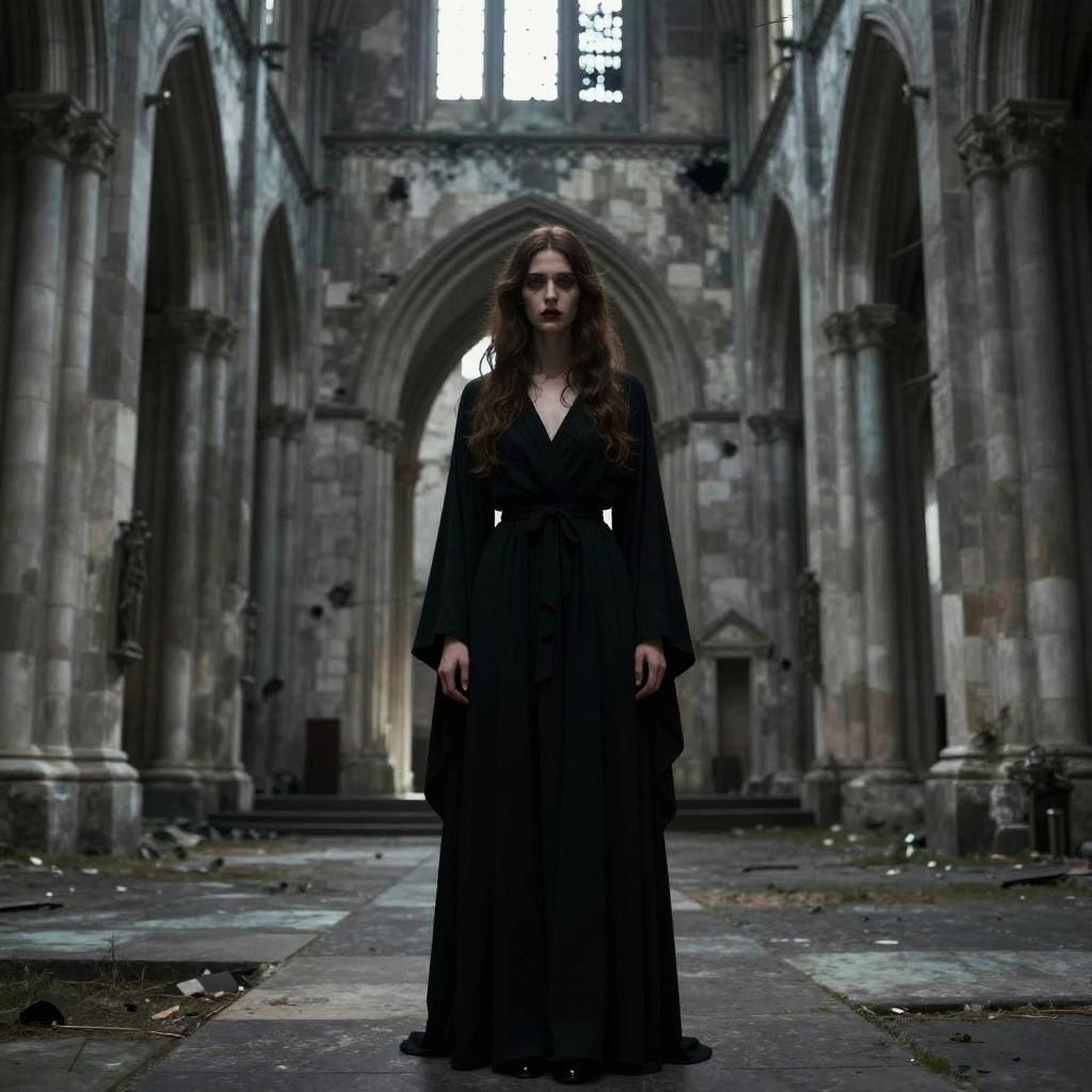 A young woman with long wavy hair wearing a long black dress stands alone in a dilapidated cathedral. The historic stone architecture with arches and pillars surrounds her, highlighting the atmosphere of solemnity and decay. The mood captures a melancholic and elegant presence within the abandoned sacred space.