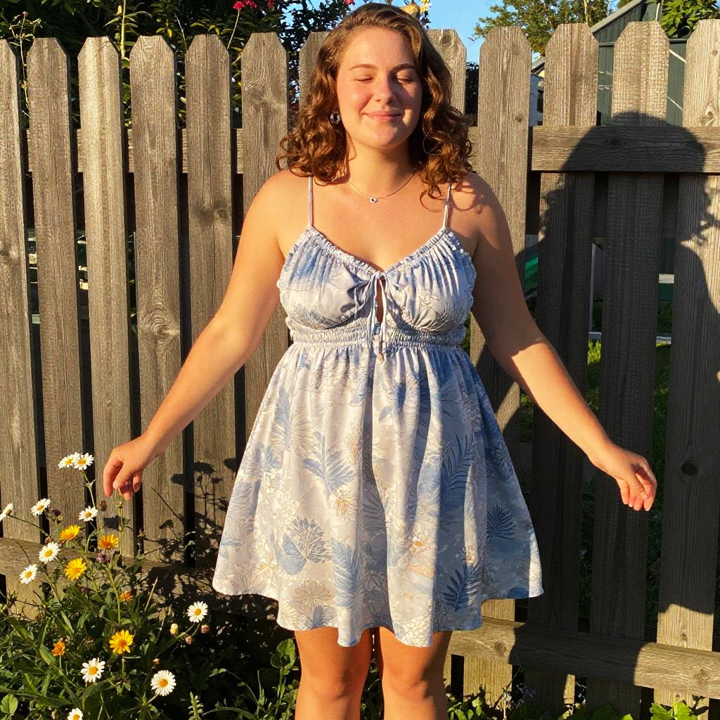 Photograph of a young woman with fair skin and wavy brown hair standing outdoors in sunlight. She is wearing a light blue, sleeveless, floral-patterned sundress with a gathered waist, exposing her shoulders and arms. She has a relaxed, smiling expression with eyes closed. Behind her is a weathered wooden fence with shadows cast on it. To her left, there is a garden bed filled with yellow and white daisies. The sun illuminates her from the front, creating a warm, natural glow. She stands slightly tilted to the right with arms relaxed by her sides.