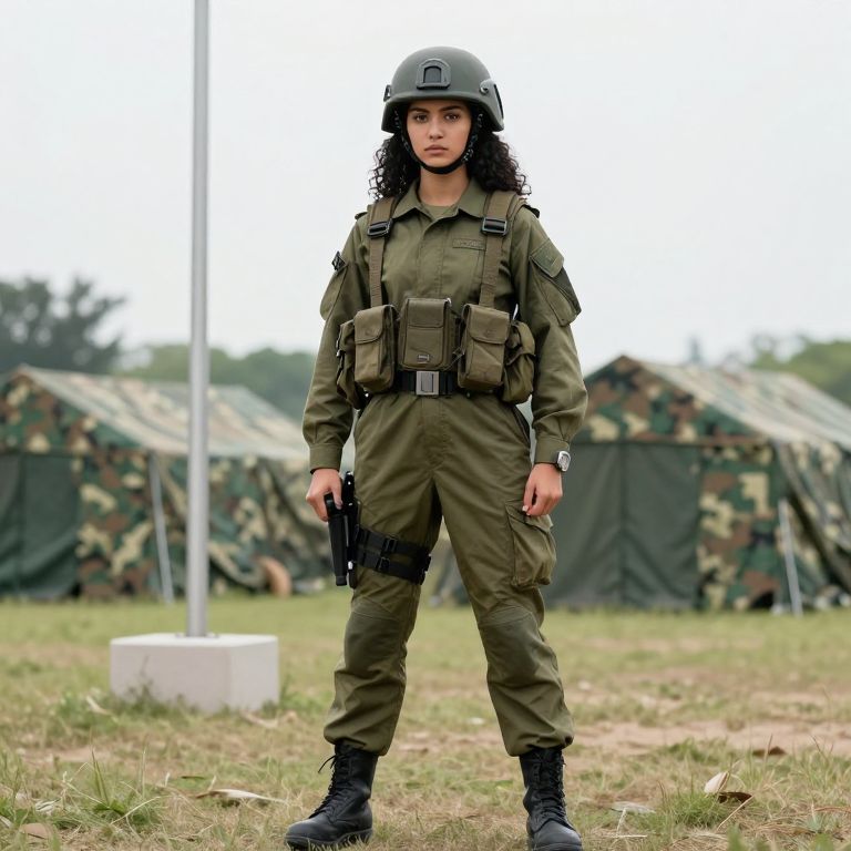 A detailed portrait of a girls in an army uniform, standing in a military training ground with a flagpole and camouflage tents in the background; she has curly black hair, defined facial features, and a strong, determined expression, wearing a full set of army gear including boots and a helmet