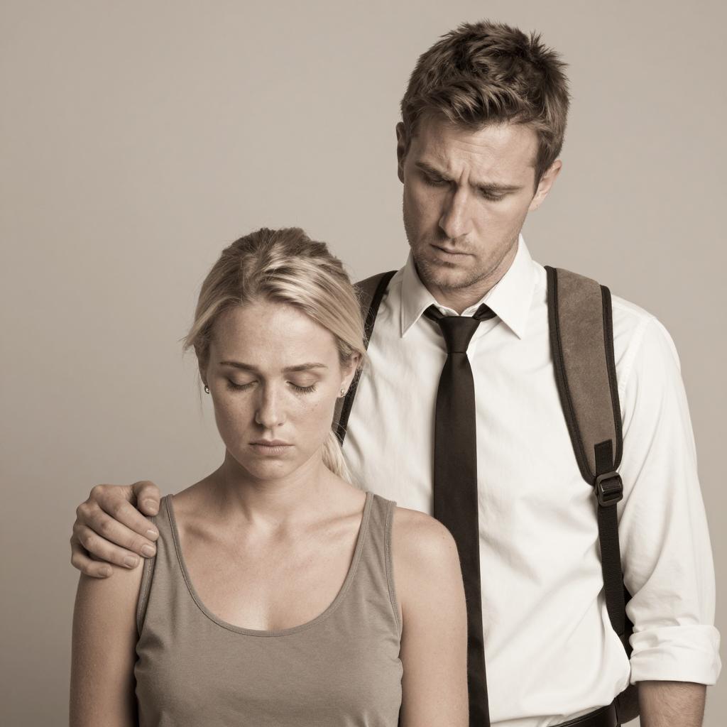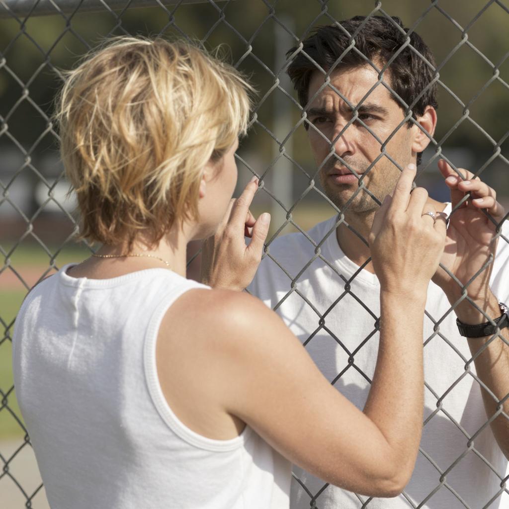 Photograph of a woman with short blonde hair in a white sleeveless top, leaning against a chain-link fence, looking at a man with dark hair and a white shirt behind the fence. Woman's hands touch the fence, man's face shows mild curiosity. Sunlight casts shadows. Woman's back to camera, man's face visible.