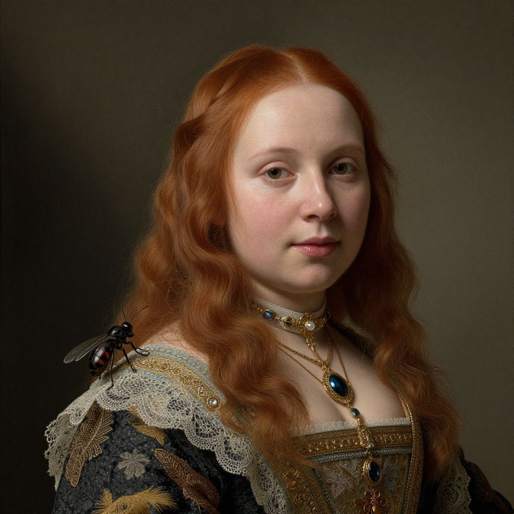 Create an enchanting portrait inspired by the meticulous realism of Dutch Golden Age painting, depicting a strikingly beautiful Inuit woman. She has delicate features and porcelain skin, accentuated by vibrant red hair that cascades in gentle waves down to her shoulders. The portrait is rendered from a unique 'bug's-eye view', as if seen from the perspective of a small insect perched on her shoulder, revealing the intricate details of her lace-trimmed gown and ornate jewelry. Warm ambient light casts soft shadows across her face, infusing the composition with a sense of timeless elegance and grace.