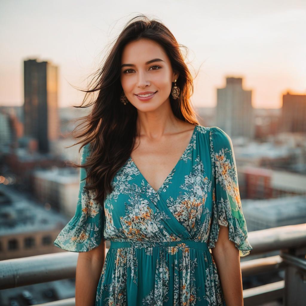 Portrait of a young woman with long dark hair wearing a teal floral dress, smiling against a blurred cityscape background during golden hour.