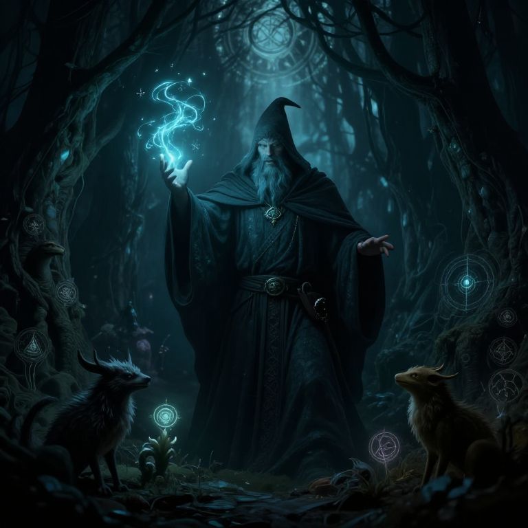 Dungeons and dragons image showcasing a mysterious wizard casting glowing spells in a dark forest, surrounded by enchanted creatures and magical symbols, intricate mystical illustration with deep shadows and glowing effects.