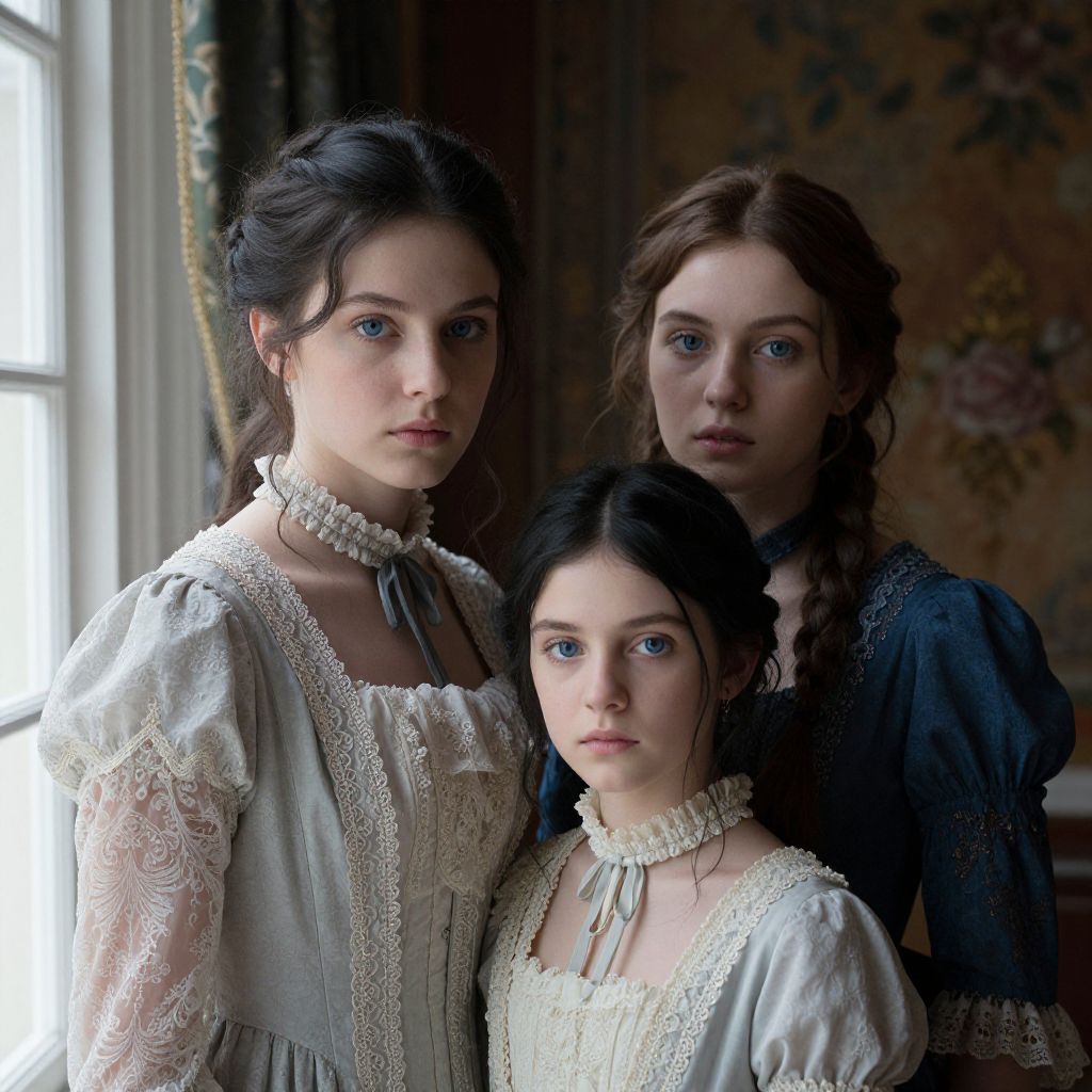 Portrait of girls with blue eyes and black hair, wearing elegant Victorian dresses, intricate lace details, soft natural lighting from a window, moody and timeless ambiance, richly textured background.