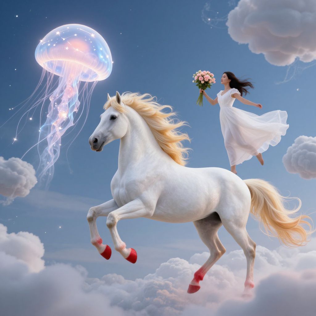 Dreamy digital art: white horse with red hooves, flying woman in white dress holding rose bouquet, next to glowing jellyfish in cloudy sky.