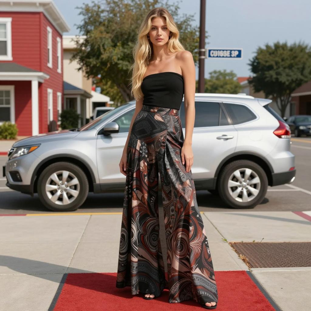 Tall blonde woman standing on a sidewalk in a suburban neighborhood. She is wearing a black strapless top paired with a long, flowing skirt featuring an abstract pattern in shades of brown, black, and beige. The background includes a silver SUV, a red house with white trim, green trees, and a street sign. The scene is set on a sunny day with a clear blue sky.