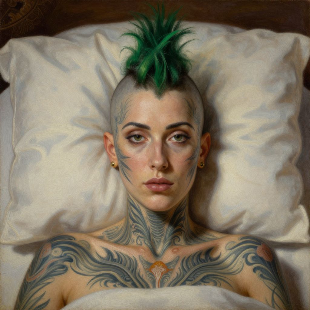 Tattoed woman with green mohawk laying in bed, intricate, elegant, highly detailed, oil canvas, symmetrical face, by gustave courbet, trending on artstation