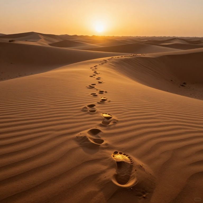 Glowing footprints trace a luminous path through rippling sand dunes as the setting sun casts a warm, golden hue over the serene desert landscape.