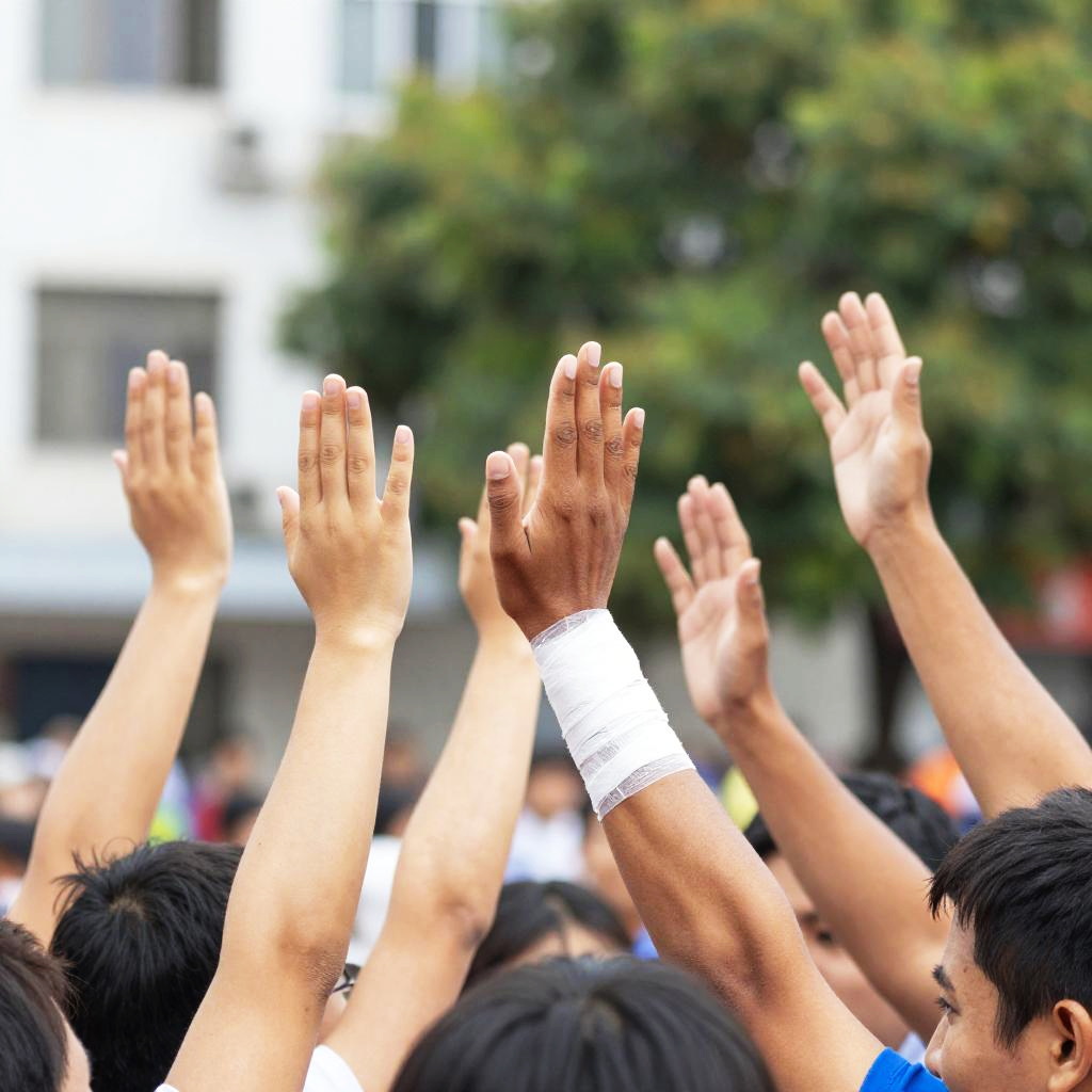 Photograph of a group of people raising their hands in a celebratory manner. The foreground features a mix of light and dark-skinned hands, with one dark-skinned hand wrapped in a white bandage. The background is blurred, showing green trees and a white building. The image has a bright, almost overexposed quality, with a casual, outdoor feel.