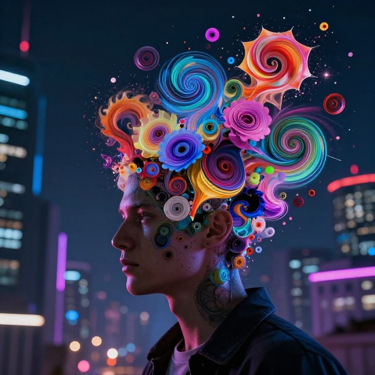 Digital art: Neon-lit cityscape background with colorful, swirling spirals emerging from a young man's head, wearing a dark jacket, in profile