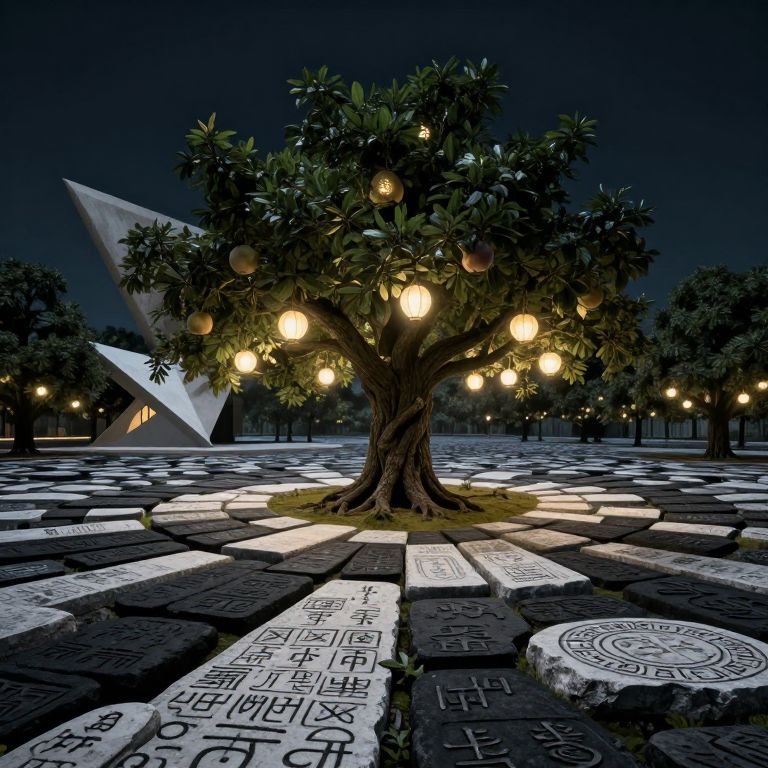 An image depicting a surreal dreamscape featuring an ancient tree standing alone in a vast field of black and white stones engraved with intricate symbols. The tree bears luminous fruit glowing like lanterns in the night, casting soft shadows on the ground. A modernist architectural structure emerges from this otherworldly orchard, its sharp angles contrasting with the dreamlike setting. This scene, balancing wonder and unease, captures a sense of curiosity between waking life and vivid dreams.
