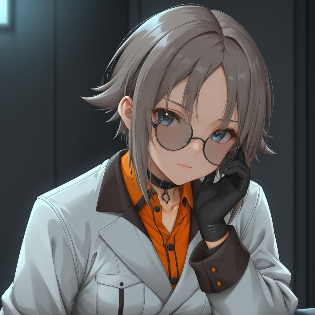 Digital anime-style illustration of a young woman with short, grayish-silver hair and blue eyes, wearing round glasses. She has a fair skin tone and is dressed in a white lab coat over an orange shirt, with a black choker and black gloves. Her right hand is raised to her glasses, adjusting them. The background is dark and blurry, suggesting an indoor, possibly lab setting. The image has a polished, modern anime aesthetic with sharp lines and vibrant colors.