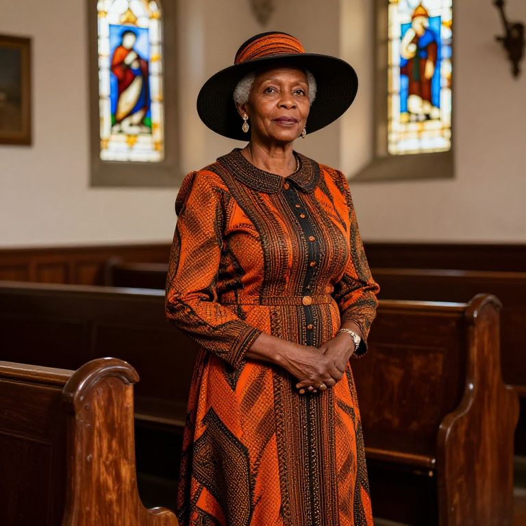Old black lady church outfit, dignified and stylish, showcasing a bold patterned dress with a matching wide-brimmed hat, standing gracefully in an old wooden pew church, stained glass windows casting colorful light, rich textures and intricate clothing details.