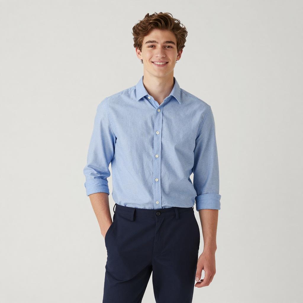 Photograph of a young Caucasian man with light skin and curly brown hair, standing against a plain white background. He is smiling gently, with his right hand in his pants pocket. He is wearing a light blue, long-sleeved button-down shirt with the sleeves rolled up to his elbows, and dark navy blue pants. The shirt is neatly pressed, and the pants are slightly loose, with a classic, formal look. The lighting is bright and even, highlighting the simplicity of the white background and the subject's relaxed, approachable demeanor.