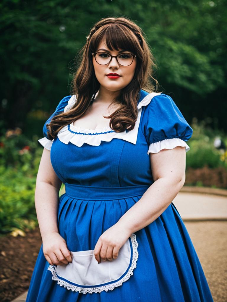 Portrait of a plus size woman with long brown hair and glasses wearing a blue dress with white ruffled details and a small white apron. She is standing outdoors with a soft-focus background of greenery and a garden path, looking directly at the camera with a confident expression.