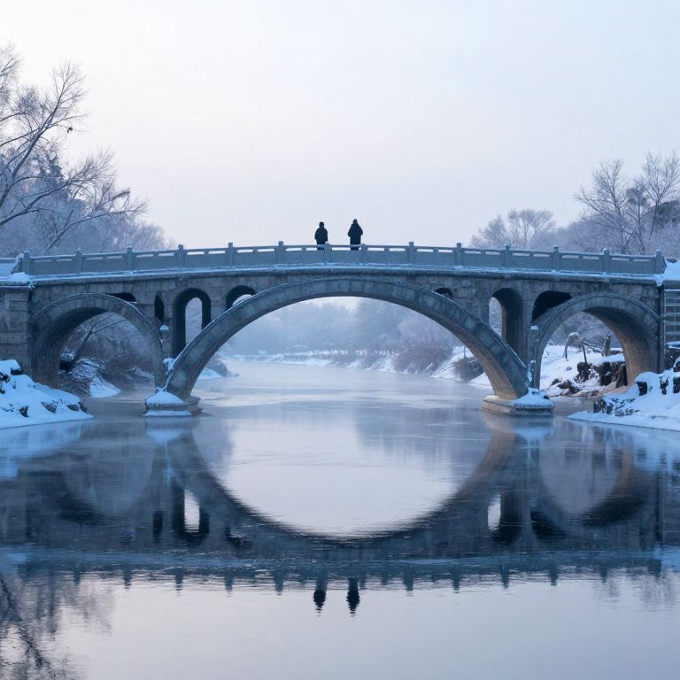 Frozen arches span a tranquil river, encased in icy formations that reflect the serene winter landscape, while silhouetted figures stand atop the bridge, gazing into the misty distance.