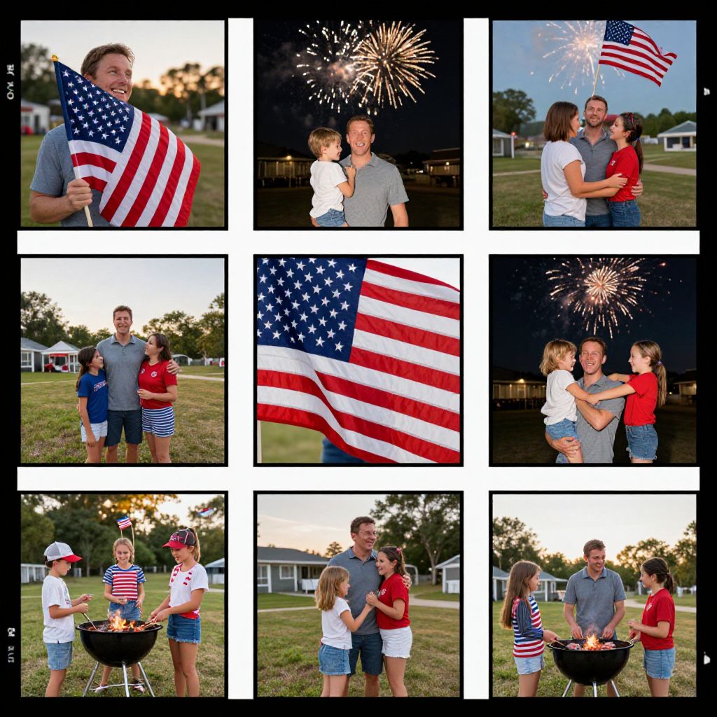 This photograph collage features eight images of a family celebrating the 4th of July. Central to the collage is a large, prominently displayed American flag with red, white, and blue stripes and stars. The background often shows a grassy field with trees and suburban houses under a twilight sky. The family, consisting of a man, woman, and two children, wears casual summer clothes, including red, white, and blue attire. They are seen holding and waving the flag, hugging, and standing around a grill with fireworks in the background. The man and woman wear jeans and T-shirts, while the children wear shorts and T-shirts. The images capture moments of affection, celebration, and patriotic pride.