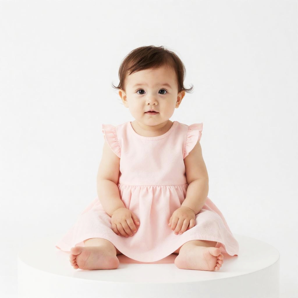 A cute baby girl with brown hair and big eyes wearing a light pink ruffle sleeve dress sitting on a round white platform against a plain white background. The baby is barefoot and looking directly at the camera.