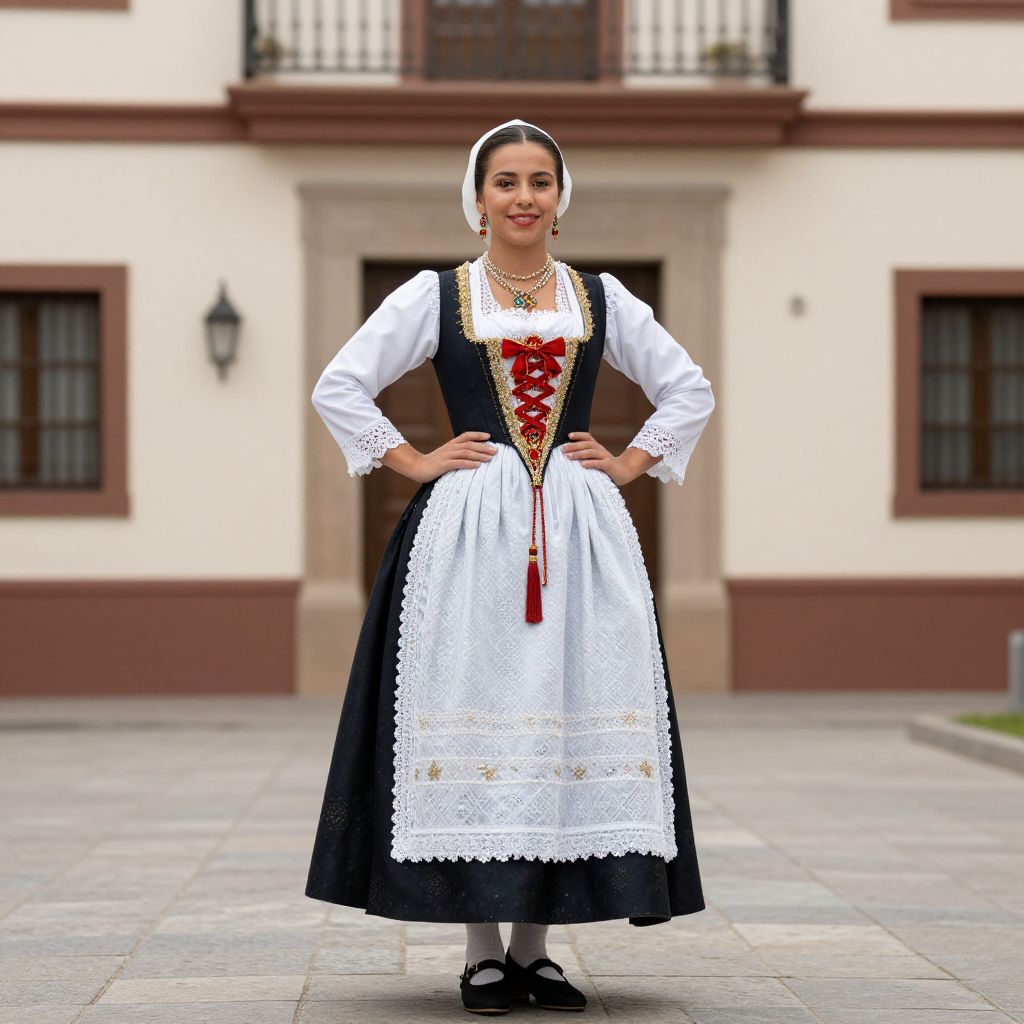 Spanish Folk Costume, woman in traditional costume standing in front of a building