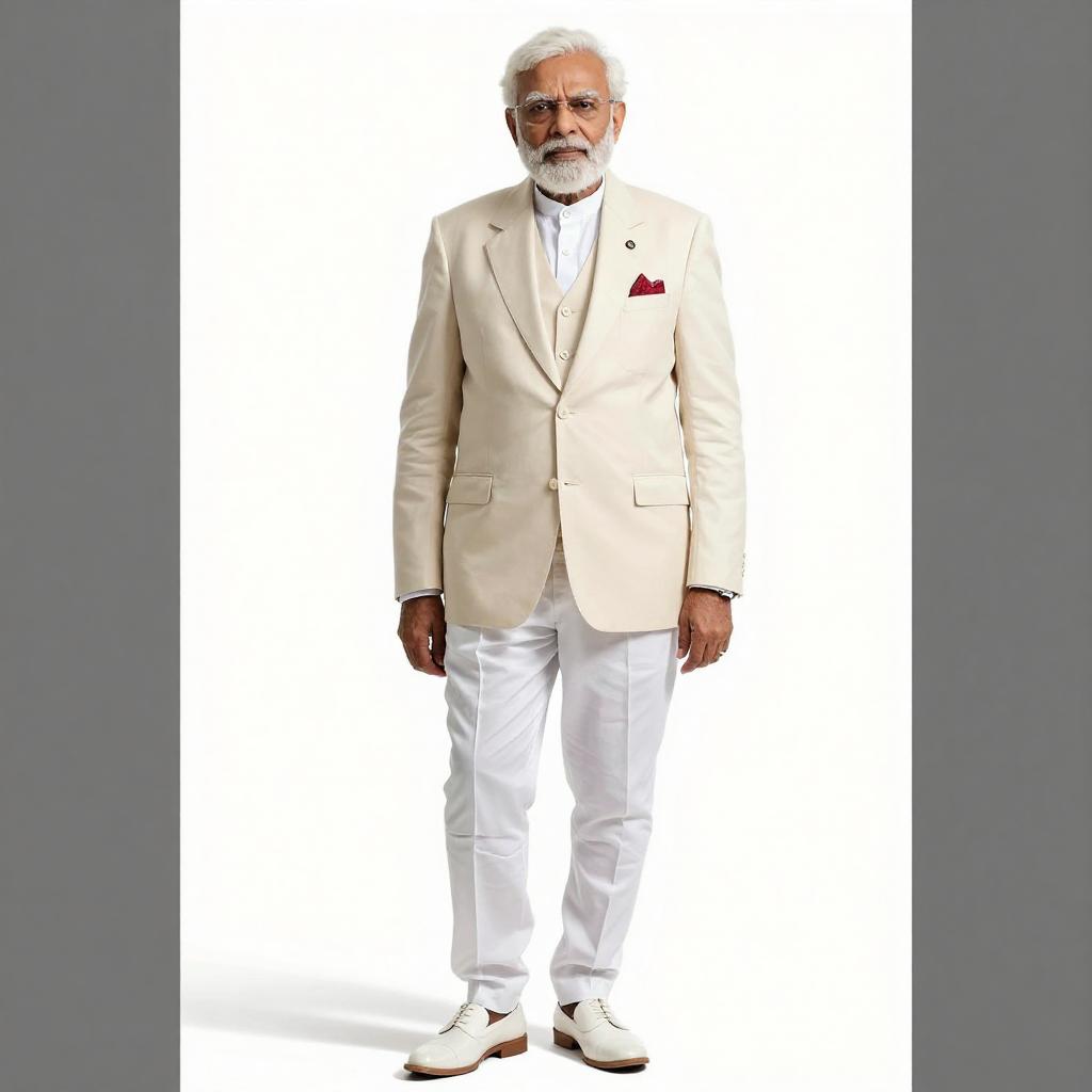 Photograph of an older Indian man with a white beard and short white hair, standing against a white background. He is wearing a light beige blazer over a white shirt, with a red pocket square, paired with white trousers and white shoes with black soles. He has a medium build and is looking directly at the camera with a neutral expression. The overall style is formal and elegant, and the image has a clean, minimalistic look with no additional objects or textures in the background.