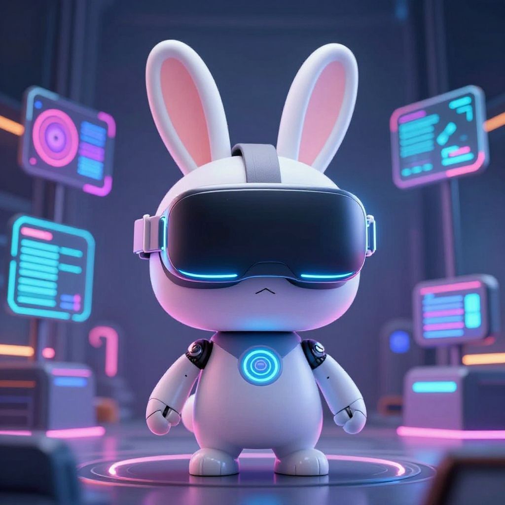 This digital CGI image showcases a futuristic white helmet with black accents, equipped with a sleek, black virtual reality (VR) headset and large, round, black headphones. The helmet is centered on a dark, grid-patterned floor illuminated by vibrant pink and purple neon lines. Surrounding the helmet are four glowing, rectangular monitors displaying colorful, abstract blue and pink data screens. The background is a dark, metallic space, enhancing the high-tech, cyberpunk aesthetic. The helmet's design is smooth and glossy, with detailed textures on the headphones and VR headset. The overall composition exudes a modern, sci-fi vibe.
