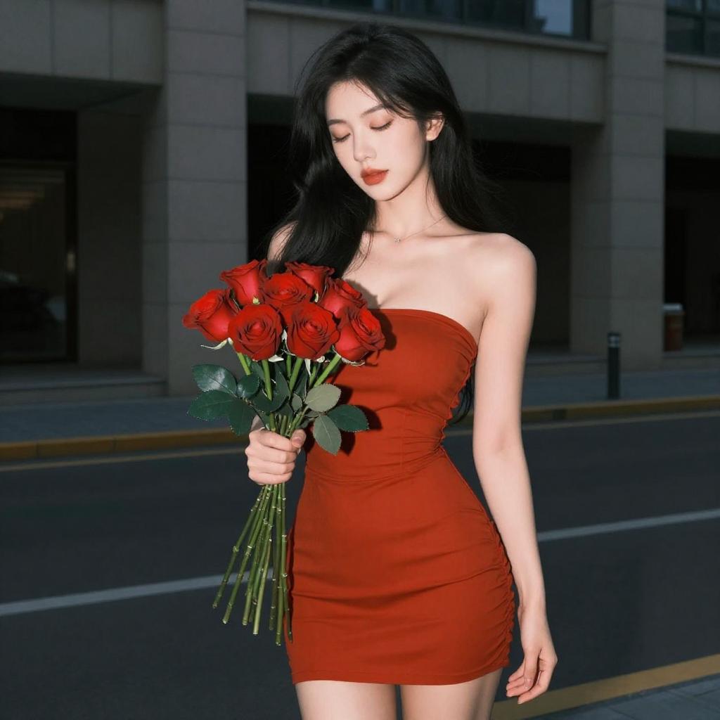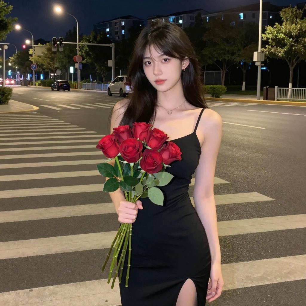 Photograph of a dark-haired woman with tan skin, wearing a black, spaghetti-strap dress, sitting on a crosswalk at night. She holds a bouquet of red roses in her left hand, with her right leg crossed over her left. Streetlights and blurred buildings are in the background. She has a confident, slightly seductive expression.