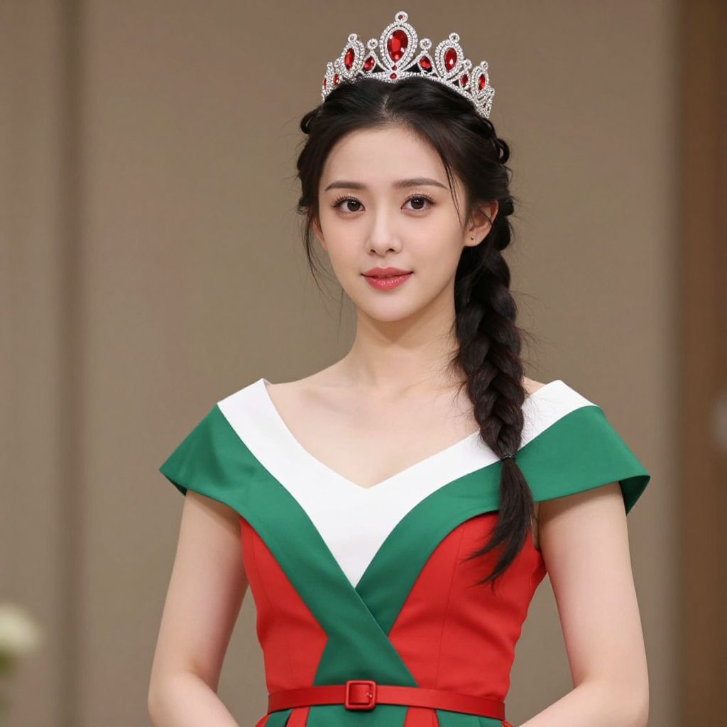 Photograph of an East Asian woman with fair skin, black braided hair, wearing a silver tiara, red and green dress, white V-neck