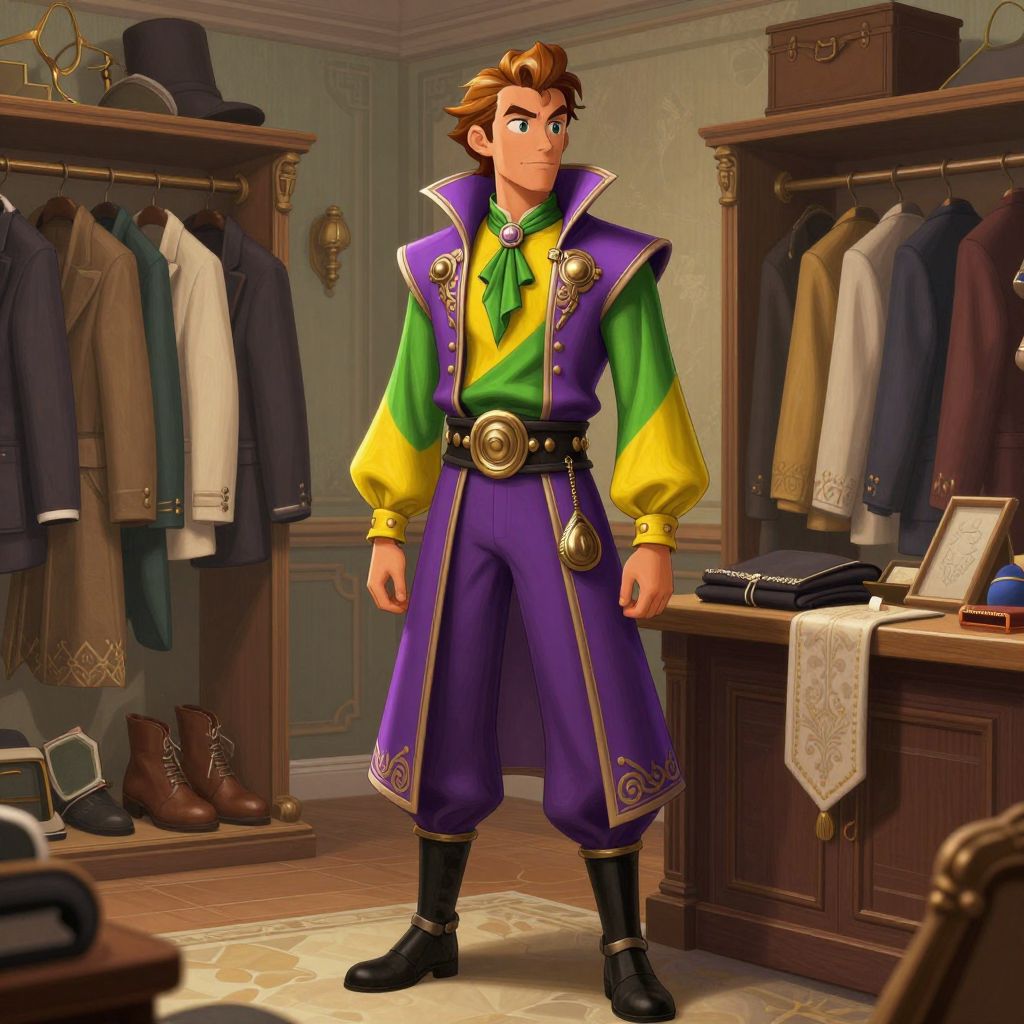 A digital illustration of a young man with short brown hair and blue eyes, standing confidently in a well-appointed dressing room. He wears a vibrant, Victorian-style outfit with a purple coat featuring gold and yellow accents, green and yellow long sleeves, and a green bowtie. His black boots and belt with a large circular buckle complete the look. The room has wooden shelves with hanging clothes, a desk with a pen holder, and a pair of brown boots on the floor. The warm, detailed background includes ornate wall sconces and a patterned rug.