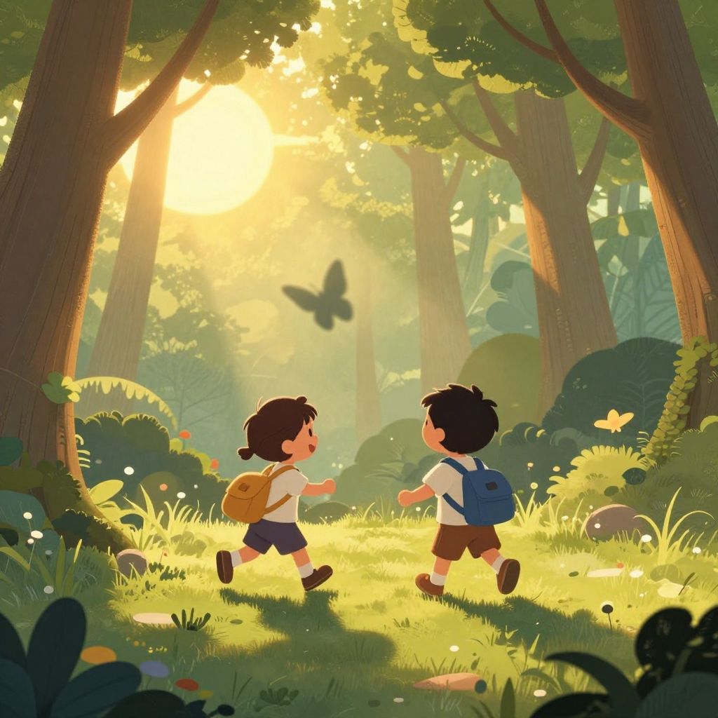 Two children explore a dreamy forest bathed in golden-hour light, their playful journey illuminated by a radiant sun as they chase butterfly-like shadows, evoking a whimsical, cartoon-style adventure where imagination feels tangible.