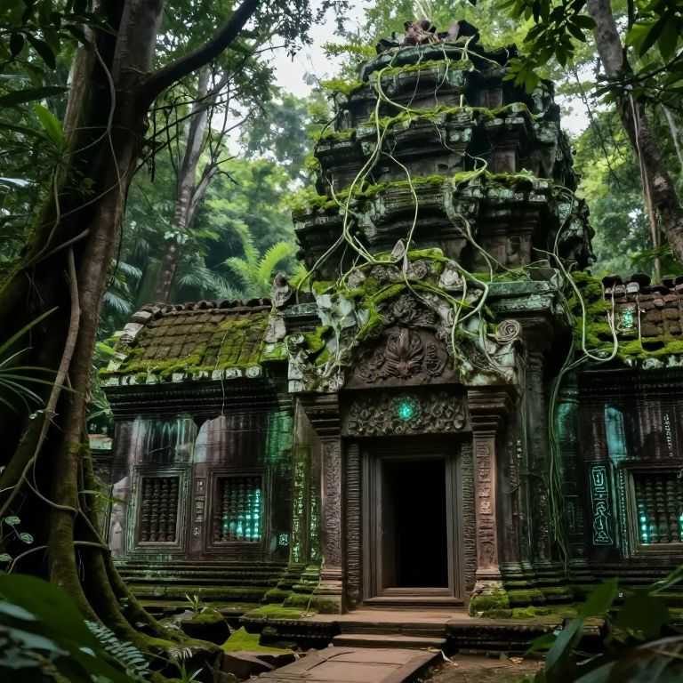Photograph of an ancient, dark brown stone temple deeply embedded in a lush, dense jungle. The temple features intricate carvings and a prominent, moss-covered tower. Vines and foliage partially obscure the structure, adding to its mystical appearance. The temple's door is centered and dark, with green-tinted glass windows on either side. The forest's vibrant green leaves and tall trees frame the scene, creating a sense of seclusion and ancient history. The ground is covered in moss and small plants, enhancing the temple's aged, natural integration into its surroundings.