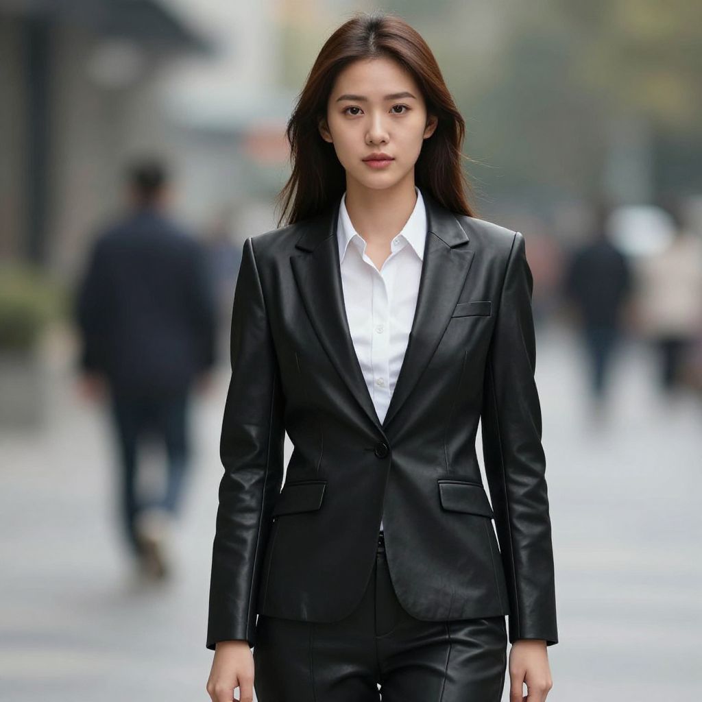 Photograph of an attractive Asian woman with long dark hair, wearing a black business suit and white shirt, walking confidently in a blurred, busy urban setting