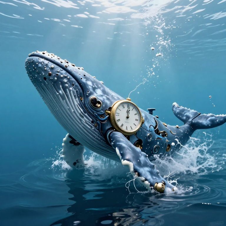 Digital art of a blue whale with a clock on its chest, swimming underwater, surrounded by bubbles and light rays.
