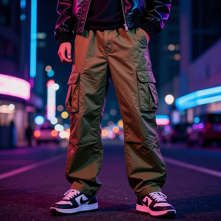 Cargo pants leather jacket casual look, nighttime neon cityscape, reflective surfaces, streetwear vibe, vibrant colors, energetic mood, detailed fabric textures, realistic style