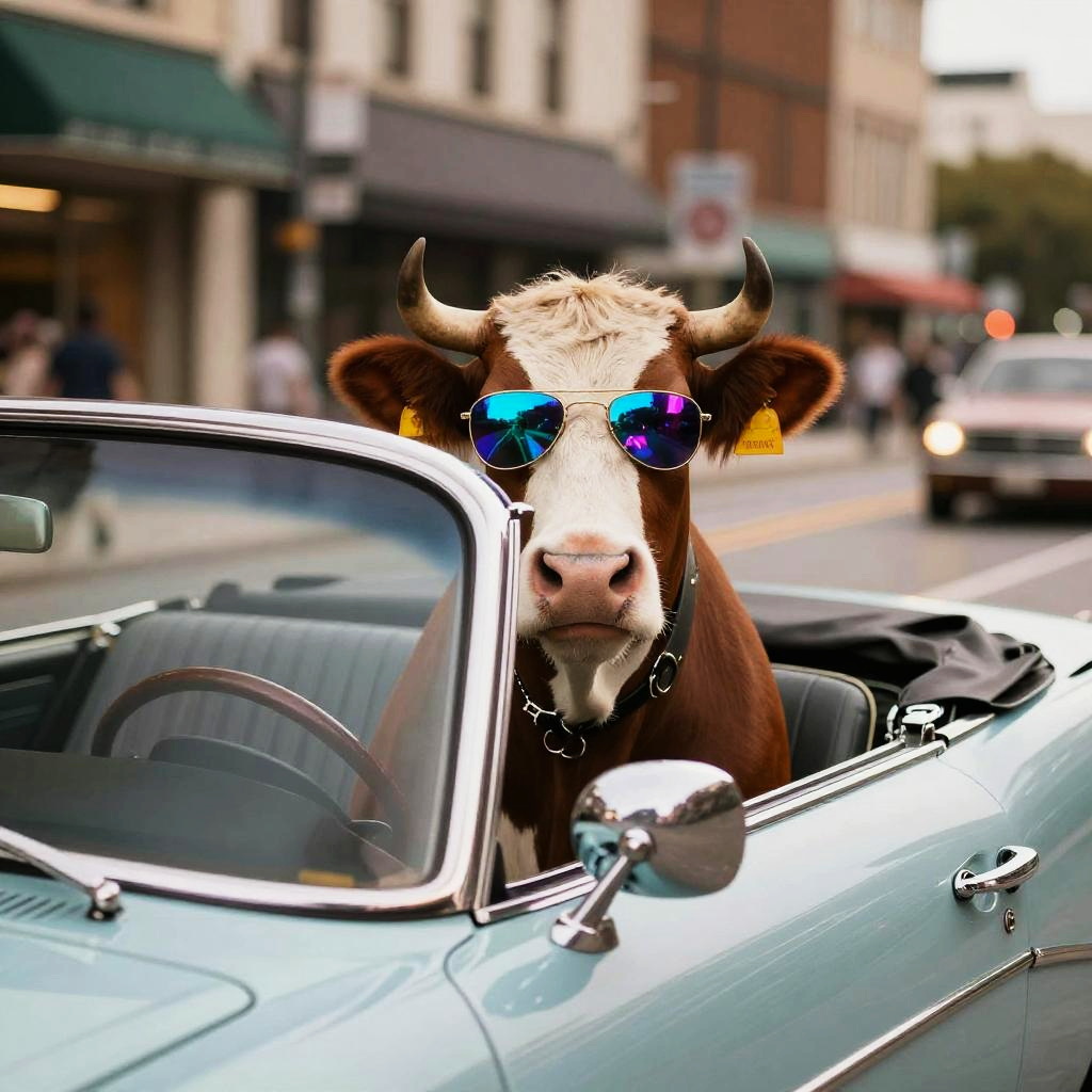 Cow with sunglasses driving a vintage convertible car, city street background, retro aesthetic, dynamic composition, neon lights reflecting on sunglasses, energetic and fun scene