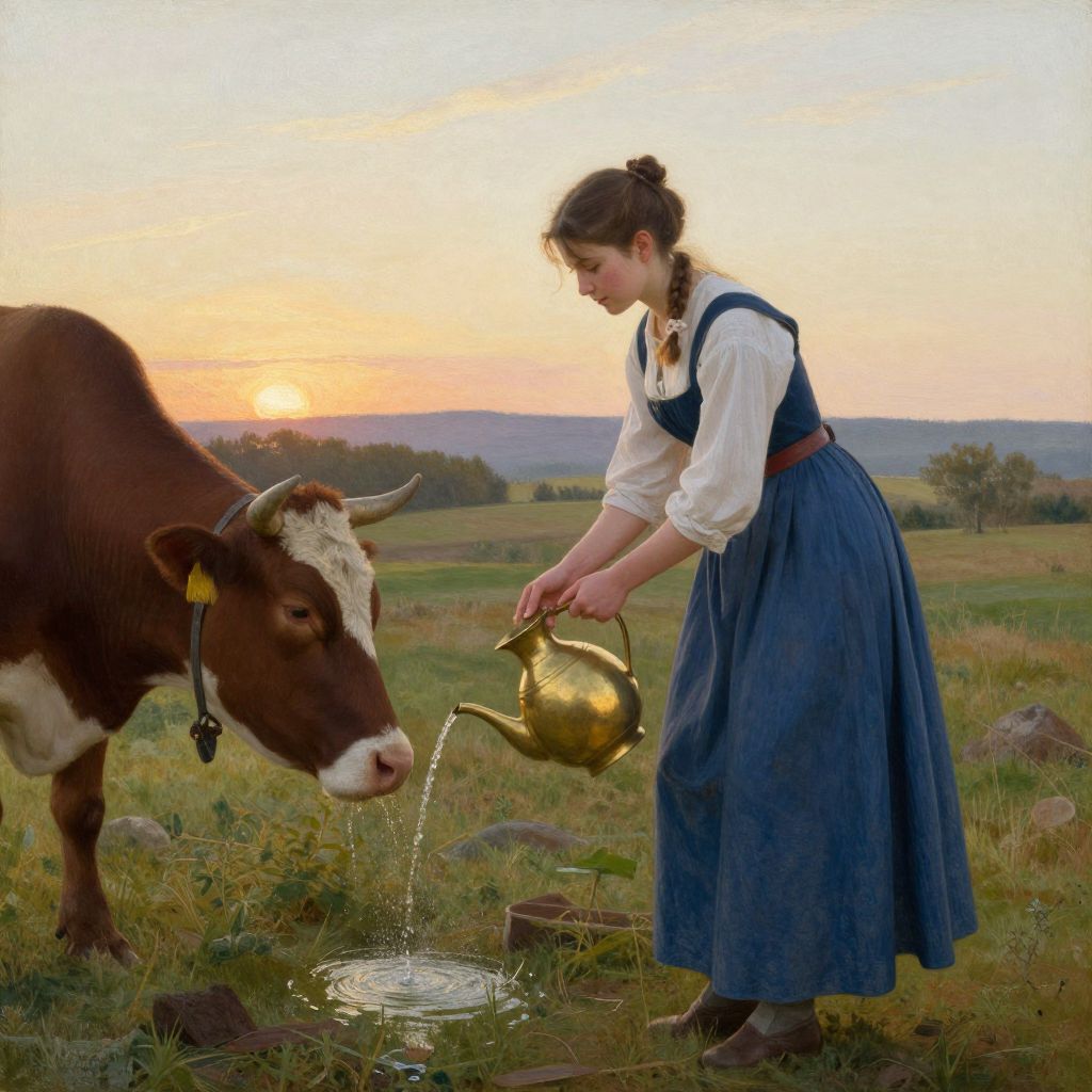 A serene oil painting by Julien Dupré depicts a young woman in traditional attire gently watering a brown cow with a brass pitcher, set against a pastoral landscape under a soft, golden-hour sky.